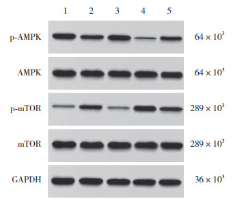 | 1, control group; 2, H/R group; 3, isoflurane group; 4, CC group; 5, isoflurane+CC group. 图 6 Western blotting检测各组H9c2细胞AMPK/mTOR信号通路蛋白表达 Fig.6 Western blotting of AMPK/mTOR signaling pathway protein expression levels in H9c2 cells in each group |
