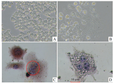 | Fig 1 Morphological identification of mature osteoclasts A:Raw 264.7 cells;B:Raw 264.7 cells were treated for 5 days;C:TRAP staining (×200);D:TRAP staining (×400) |