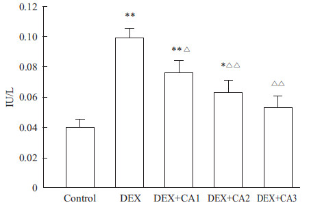 CA1:11.6 μg·L-1;CA2:23.2 μg·L-1;CA3:46.4 μg·L-1. *P<0.05,**P<0.01 vs control group;ΔP<0.05,ΔΔP<0.01 vs DEX group |