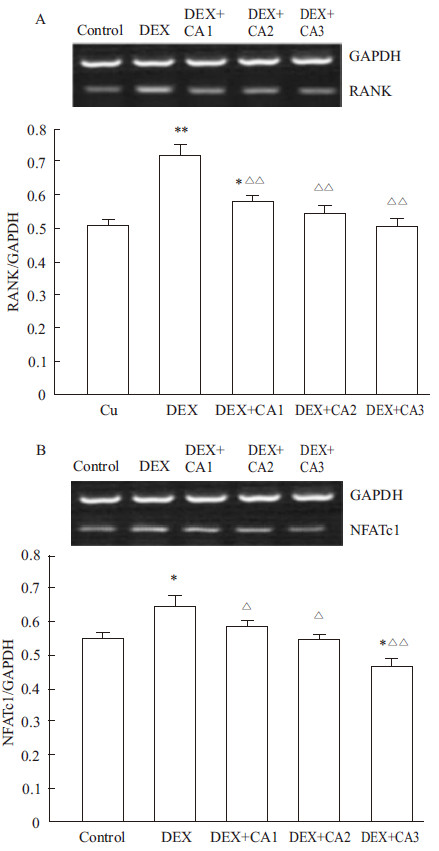 | Fig 4 Down-regulatory effect of CA on DEX-induced overexpressions of RANK,NFATc1 mRNA A:The expression of RANK mRNA;B:The expression of NFATc1mRNA,CA1:11.6 μg·L-1;CA2:23.2 μg·L-1;CA3:46.4 μg·L-1,*P<0.05,**P<0.01 vs control group;ΔP<0.05,ΔΔP<0.01 vs DEX group |