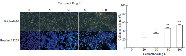 2.4 Hoechst 33258观察细胞凋亡情况收集对数生长期的AGS细胞1×108·L-1,接种于铺有无菌盖玻片的6孔板内,5% CO2、37℃恒温箱培养过夜。加入浓度分别为0、20、50、80、100 mg·L-1 cecropinXJ处理24 h,弃去培养液,PBS洗涤后用95%乙醇4℃固定10 min。去固定液,用PBS洗2次后,加入终浓度为0.5 g·L-1的Hoechst 33258染色液,于4℃避光染色10 min。PBS洗涤后,50%甘油封片剂封片,荧光显微镜观察拍照。镜下随机计数10个视野,按以下公式计算:细胞凋亡率/%=(凋亡细胞数/总细胞数)×100%。