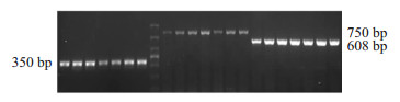 观察PCR产物电泳结果,350 bp(APP)和608 bp(PS1)处均出现明显条带者为阳性APP/PS1双转基因小鼠(Fig1)。