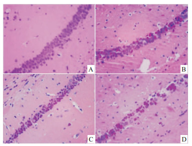 1.2.4 组织病理学检查每组取4只小鼠,40 g·L-1水合氯醛(0.1 ml·kg-1,i.p.)麻醉,仰卧位固定于蛙板上。以肝脏作为血液及灌注液出口,每只小鼠用约30 ml预冷肝素化生理盐水及50 ml 40 g·L-1多聚甲醛磷酸盐缓冲液,经左心室快速滴入,进行在体灌流及脑固定。完整分离脑组织,4℃保存于40 g·L-1多聚甲醛2~3 d,梯度乙醇脱水,石蜡包埋,冠状切面连续切片,厚约4~5 μm,HE染色,光镜下观察海马及皮层神经元形态变化。