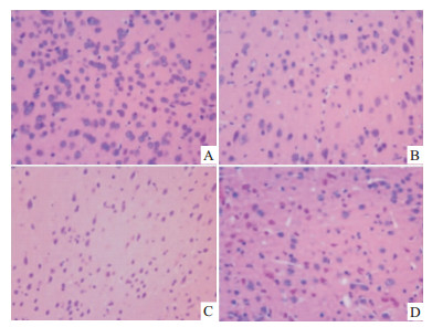 | Fig 3 Effect of misoprostol on neuronal damage of APP/PS1 transgenic mice cortex (HE×400) A:Youth group; B:Elderly group; C: APP/PS1 group; D: Misoprostol-trearted group |
