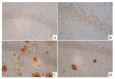 1.2.6 Aβ表达检测[15]采用免疫组织化学法检测,取1.2.4所述石蜡切片,常规脱蜡至水,枸橼酸高温修复抗原,30 g·L-1 H2O2 孵育,山羊血清封闭,1 ∶ 100 Aβ一抗4℃孵育过夜,二抗室温孵育30 min,辣根酶标记的链霉卵白素工作液室温孵育后,镜下滴加DAB至显色,自来水充分冲洗,复染、脱水、透明、封片,显微镜下观察海马及皮层Aβ表达情况,每组4只小鼠各取1张切片,每张切片取400×光镜下3个不同视野,用软件Image-pro plus 6.0进行光密度分析。