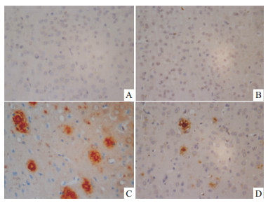 | Fig 5 Effect of misoprostol on Aβ expression of APP/PS1 transgenic mice cortex (×400) A:Youth group; B:Elderly group; C: APP/PS1 group; D:Misoprostol-trearted group |