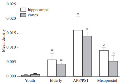 青年对照组小鼠海马和皮层神经细胞几乎检测不到Aβ的表达,老年对照组小鼠海马和皮层神经细胞内有少量Aβ表达,胞外未见明显Aβ聚积;而在转基因模型组小鼠海马和皮层不但胞内表达Aβ,且胞外Aβ大量聚积,形成明显老年斑;给予米索前列醇后,转基因小鼠海马和皮层Aβ表达减少,聚积形成的老年斑得到改善(Fig4,Fig5)。Image-Pro Plus 6.0分析各组图片平均光密度值,老年对照组小鼠海马和皮层Aβ光密度值较青年对照组明显增加(P<0.01),转基因模型组小鼠海马和皮层Aβ光密度值较老年对照组明显增加(P<0.05),给予米索前列醇后,转基因小鼠海马和皮层Aβ光密度值明显降低(P<0.05,Fig6)。
