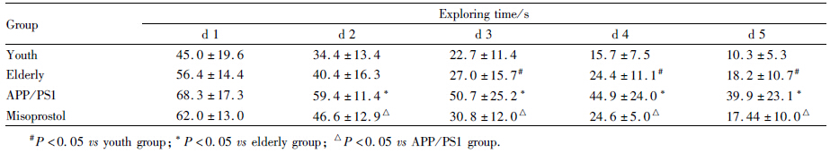 与青年对照组小鼠相比,老年对 照组小鼠寻台潜伏期延长(P<0.05),而转基因模型组小鼠较老年对照组小鼠寻台潜伏期延长(P<0.05),给予米索前列醇后,可明显缩短APP/PS1转基因小鼠寻台潜伏期(P<0.05,Tab1)。