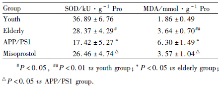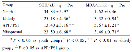 与青年对照组小鼠相比,老年对照组小鼠海马SOD活性明显降低(P<0.05),MDA含量明显升高(P<0.01),皮层SOD活性明显降低(P<0.05),MDA含量明显升高(P<0.05)。与老年对照组小鼠相比,转基因模型组小鼠海马SOD活性明显降低(P<0.05),MDA含量明显升高(P<0.05),皮层SOD活性明显降低(P<0.01),MDA含量明显升高(P<0.05)。给予米索前列醇后,转基因小鼠海马SOD活性明显升高(P<0.05),MDA含量明显降低(P<0.05),皮层SOD活性明显升高(P<0.05),MDA含量明显降低(P<0.05,Tab2,Tab3)。