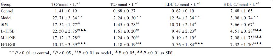 经One-way ANOVA分析,模型组的TC、LDL-C、TG表达水平明显升高,HDL-C水平明显降低,与正常对照组比较,差异具有显著性(P<0.01),提示造模成功。TFSB各剂量组的TG、TC水平明显降低,与模型组相比,差异具有显著性(P<0.01);TFSB各剂量组的LDL-C水平明显降低,与模型组相比,差异具有显著性(P<0.05或P<0.01);TFSB各剂量组的HDL-C水平明显升高,与模型组比较,差异有显著性(P<0.01)。TFSB高剂量组降低TC、TG、LDL-C的作用及升高HDL-C的作用均优于阳性对照药辛伐他汀。见Tab2。