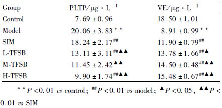 经 One-way ANOVA 分析,模型组PLTP的水平均明显高于正常对照组,VE水平明显低于正常对照组,差异均具有显著性(P<0.01)。TFSB中、高剂量组的PLTP表达水平较模型组明显降低(P<0.01),VE水平较模型组明显升高(P<0.01),差异亦具有显著性,且作用优于辛伐他汀组。经 Linear Regression 相关性分析,PLTP水平与VE水平呈负相关(r=-0.675,P<0.01)。见Tab3。