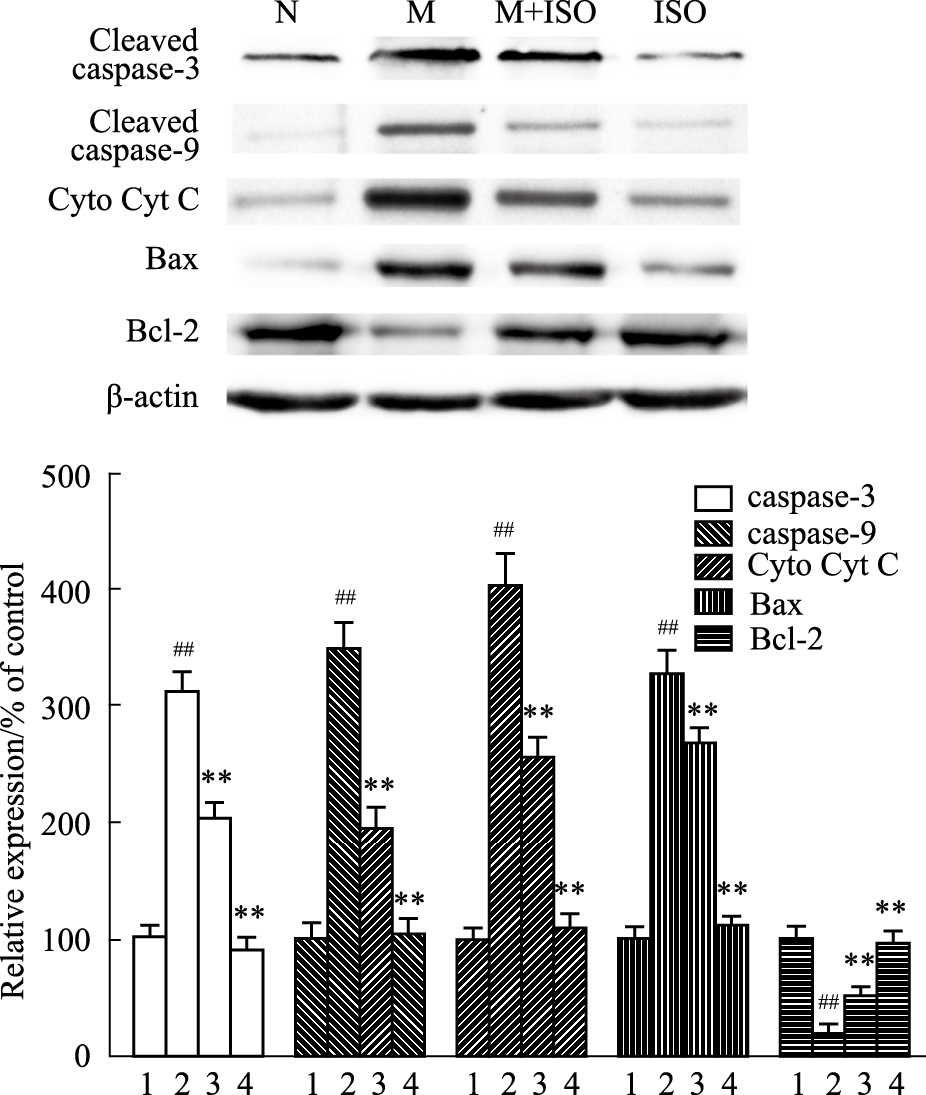 | Fig 3 Effect of isorhamnetin on apoptotic signal pathway of oxidatively injured H9C2 cell line 1:N;2:M;3:M+ISO;4:ISO. H9C2 cells were pretreated with or without ISO, followed by H2O2 injury. The expressions of apoptosis related proteins were observed and the statistical results were given below. All experiments were repeated 3 times, and the most representative result was given. ##P<0.01 vs N group;**P<0.01 vs M group. |