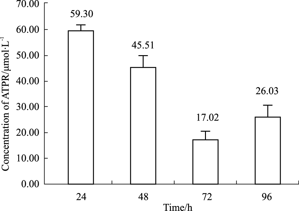 如Tab2所示,与空白对照组相比,溶剂对照组A490变化不明显,表明无水乙醇 (0.05 %)作为溶剂对细胞增殖无影响,因此可排除无水乙醇对本实验的影响。显微镜下观察各组细胞发现,与溶剂对照组比较,ATPR(10-4 mol·L-1) 体外给药24 h时即对MDA-MB-231细胞的增殖产生明显影响,细胞形态皱缩,细胞凋亡;ATPR(10-5、10-6、10-7、10-8、10-9 mol·L-1) 体外给药24 h时对MDA-MB-231细胞增殖并无明显影响,但作用48、72和96 h后,ATPR (10-5、10-6、10-7、10-8、10-9mol·L-1)对细胞增殖均具有不同程度的抑制作用。如Fig2所示,72 h时ATPR对MDA-MB-231细胞抑制作用的IC50值最低。