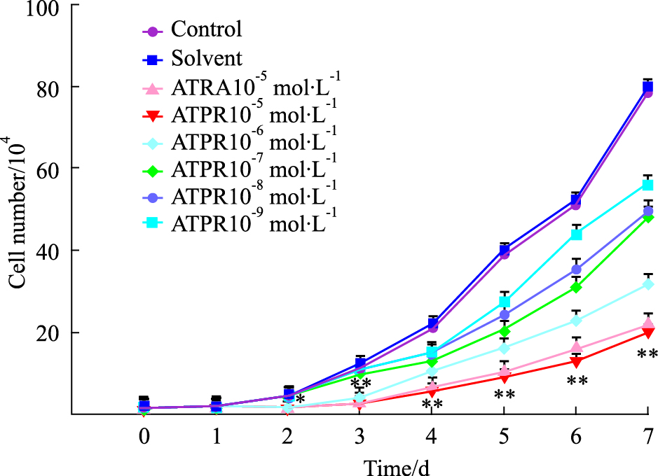 1:Control;2:Solvent;3:ATPR(10-5mol·L-1);4:ATPR(10-6 mol·L-1);5:ATPR(10-7 mol/L);6:ATPR(10-8 mol·L-1);7:ATPR(10-9 mol·L-1);8:ATRA(10-5mol·L-1),*P<0.05, **P<0.01 vs the solvent group.