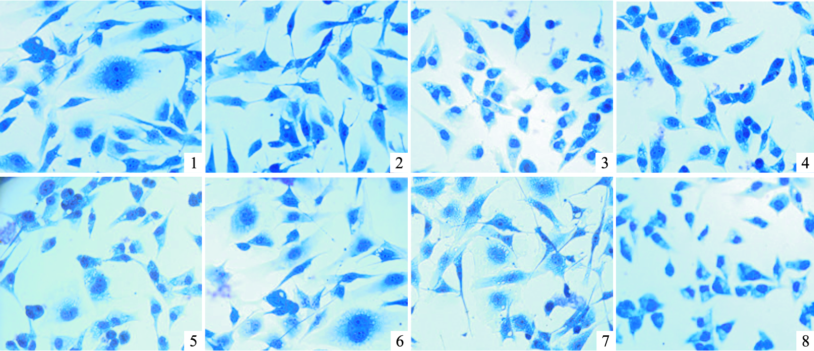 | Fig 4 Effect of ATPR on the morphological changes of MDA-MB-231 cells after 72h (400×) 1:Control;2:Solvent;3:ATPR(10-5mol·L-1);4:ATPR(10-6 mol·L-1);5:ATPR(10-7 mol·L-1);6:ATPR(10-8 mol·L-1);7:ATPR(10-9 mol·L-1);8:ATRA(10-5mol·L-1). |