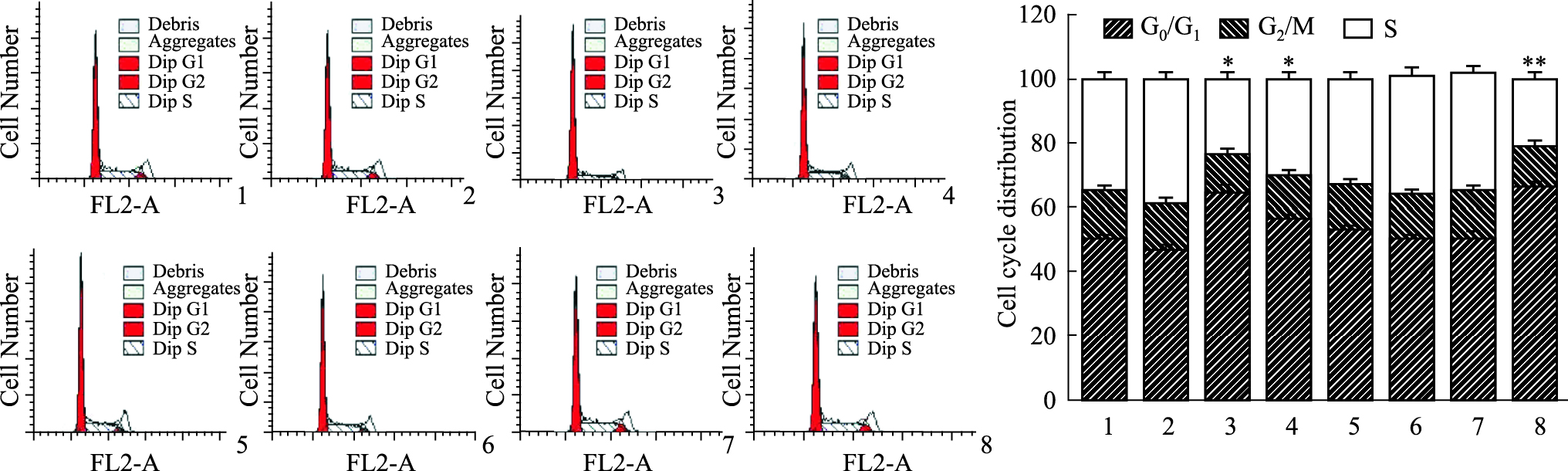 1.7 细胞周期和DNA倍体分析取对数生长期细胞,以1×106个/孔的浓度接种于6孔板,实验分组同1.3,作用72h后,收集细胞,用PBS洗涤2次,70%冷乙醇-20℃冰箱固定过夜。固定后的细胞离心,弃上清,加入碘化丙啶(PI,终浓度为100 mg·L-1)和RNase(终浓度为50 mg·L-1),4℃避光染色30 min后,在EPICS XL MCL型流式细胞仪上分析,检测3×104以上细胞,并用ModfitLT软件进行DNA倍体及细胞周期分析。