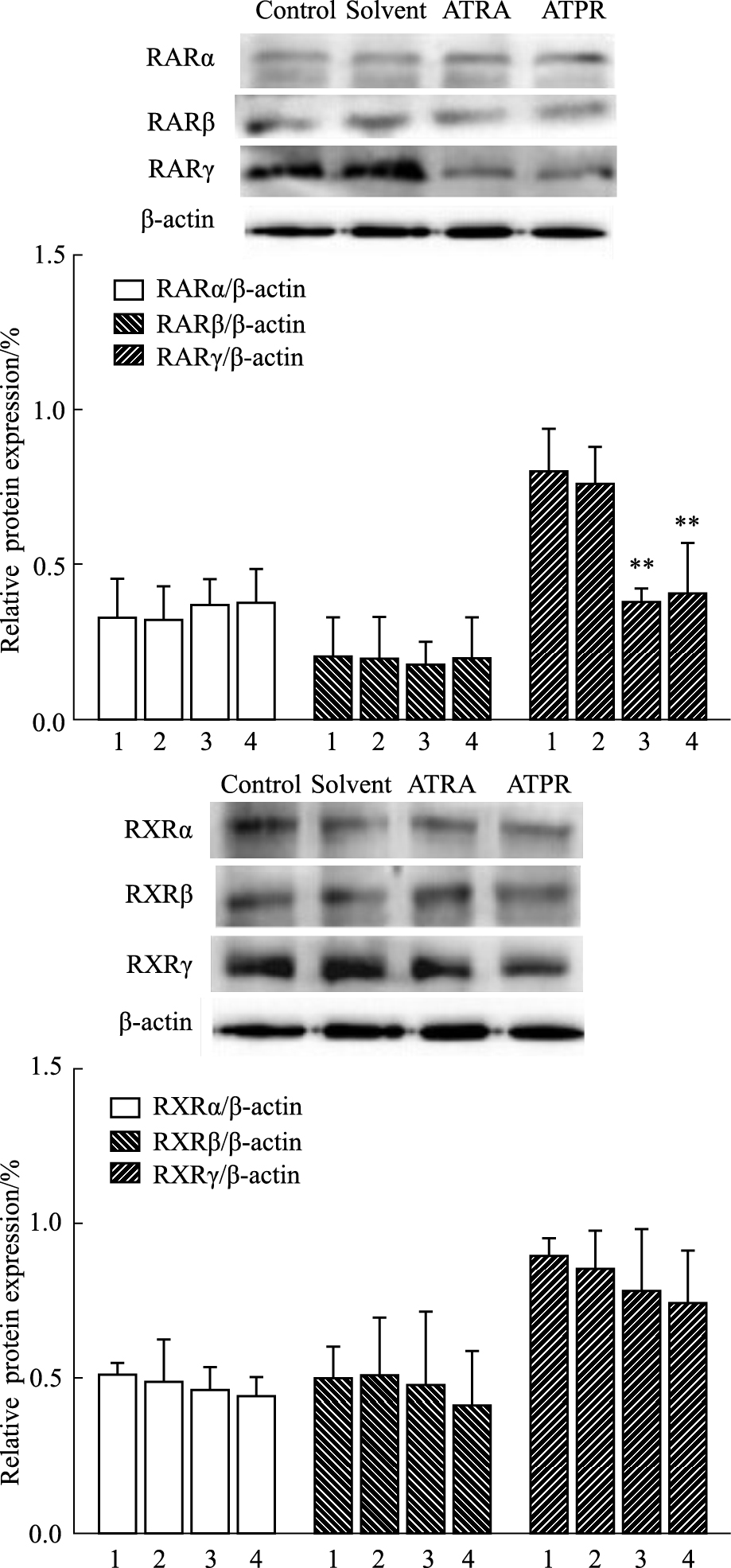 Effect of ATPR on the proteins expression of retinoic acid receptors (RARs) and retinoid X receptors (RXRs) in MDA-MB-231 cells (n=3, ± s)