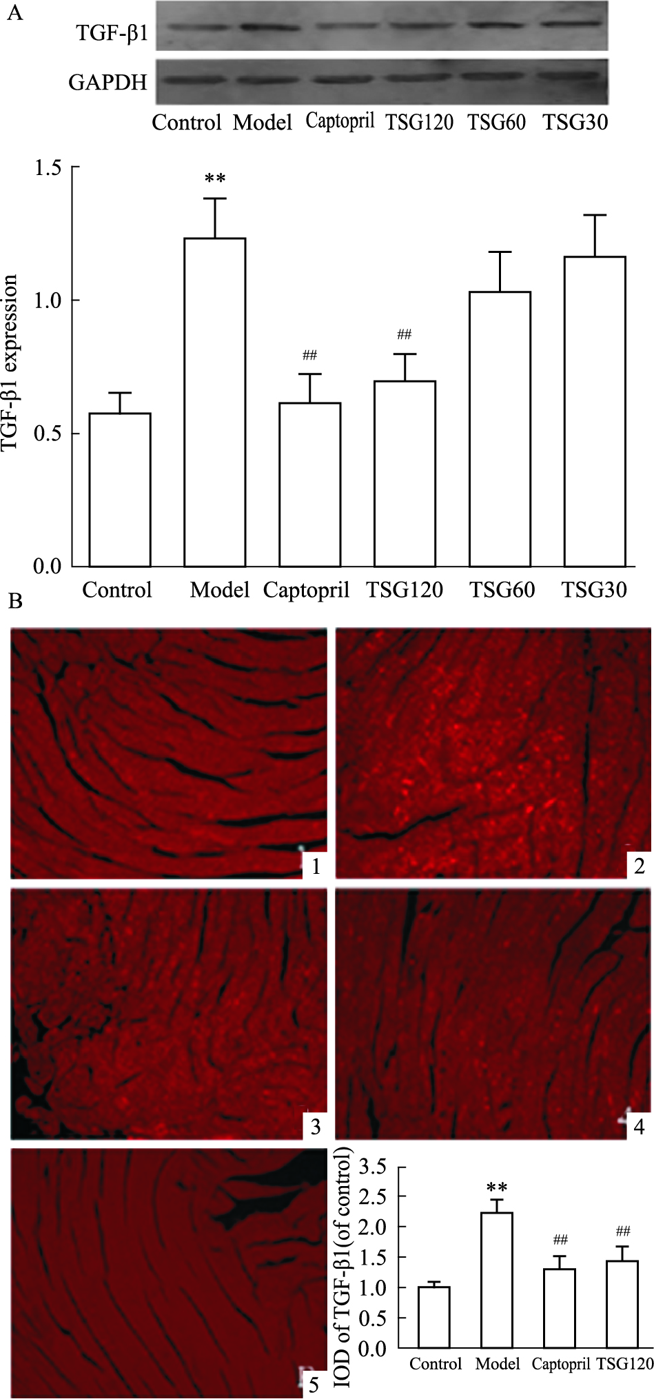 A: Western blot analysis of TGF-β1 protein expression. B: Representative immunofluorescence images of TGF-β1 (100×). 1: control group; 2: model group; 3: Captopril (40 mg·kg-1) group; 4: 120 mg·kg-1 TSG group. 5: Blank control. IOD of TGF-β1 normalized to the control group. TSG 120:TSG, 120 mg·kg-1; TSG 60:TSG, 60 mg·kg-1; TSG 30:TSG, 30 mg·kg-1. **P < 0.01 vs control; ## P < 0.01 vs model.