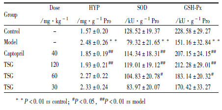 1.1.2 药品及试剂二苯乙烯苷口服液由南通大学医学院中药研究室提取提供,含量>95% (HPLC法),批号20130702;异丙肾上腺素购于上海禾丰制药有限公司,批号130701;卡托普利购于上海衡山药业有限公司,批号120308;羟脯氨酸(hydroxyproline,HYP)、超氧化物歧化酶(superoxide dismutase,SOD)、谷胱甘肽过氧化物酶(glutathione peroxidase-Px,GSH-Px)检测试剂盒购于南京建成生物公司;胶原Ⅰ型 (CollagenⅠ)和胶原Ⅲ型(Collagen Ⅲ)一抗购于Proteintech Group公司;转化生长因子-β1(transforming growth factor-β1,TGF-β1)一抗购于巴傲得生物科技有限公司公司;内参GAPDH购于康成生物;鼠抗、兔抗等二抗均购自 Odessey 公司;山羊血清封闭液购于EATAR公司;Cy3标记山羊抗兔IgG、BCA蛋白定量试剂盒、细胞裂解液均购于碧云天公司。其它试剂均为国产分析纯。