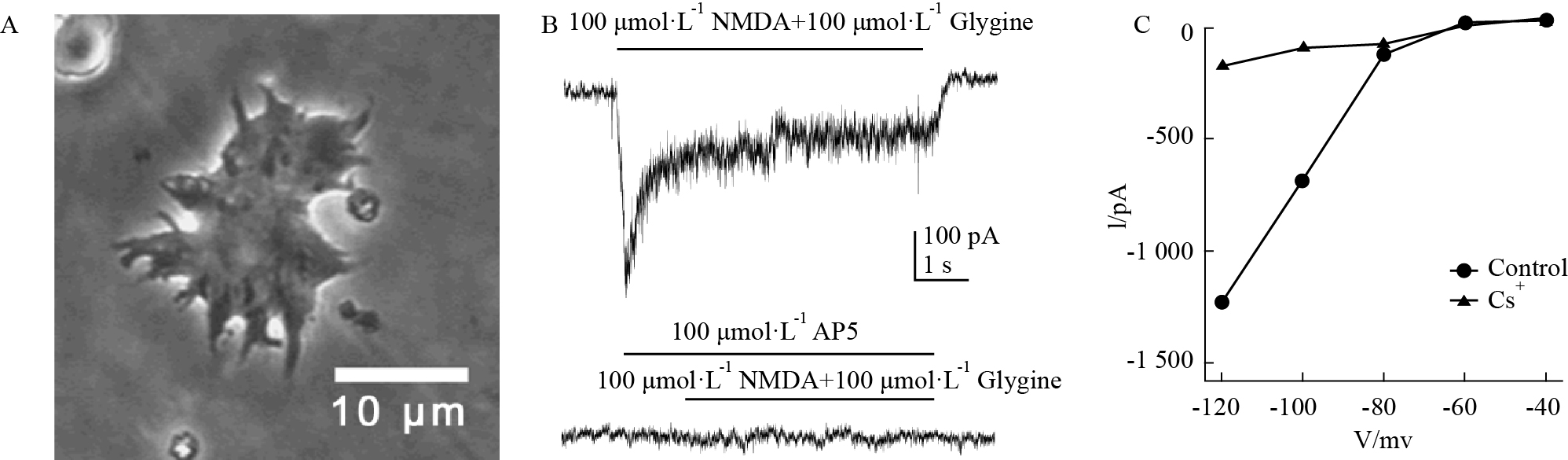 2 结果 2.1 视网膜水平细胞上的NMDA受体和内向整流钾通道采用急性分离的H1型视网膜水平细胞(Fig1A)进行全细胞电压钳记录,钳制电压为 -60 mV。当快速给予NMDA (100 μmol·L-1) 和 Glycine (100 μmol·L-1)时,可以记录到明显的内向电流,即NMDA受体激活引发的电流,此电流可以被NMDA受体阻断剂AP5所阻断(Fig1B)。