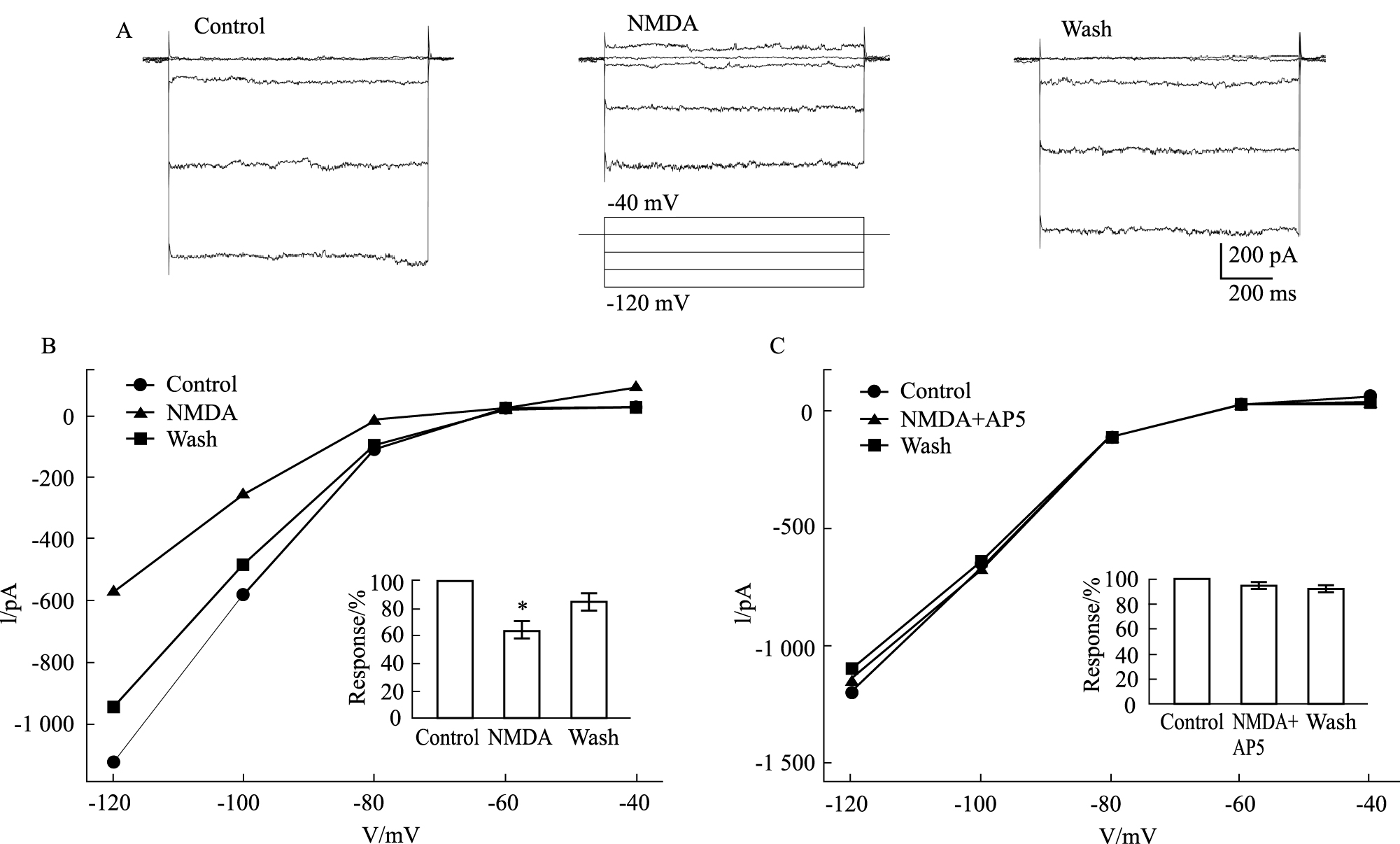 | Fig.2 Inhibition of inward potassium currents by activation of NMDA receptors A:Inward potassium currents of a horizontal cell were recorded under control,application of NMDA and wash conditions;B:I-V curves of above horizontal cell were established under above conditions. Small figure showed NMDA modulation of normalized currents from 5 cells under -120mV (*P<0.05).C:Inhibition of inward potassium channels by NMDA was removed after application of AP5. |