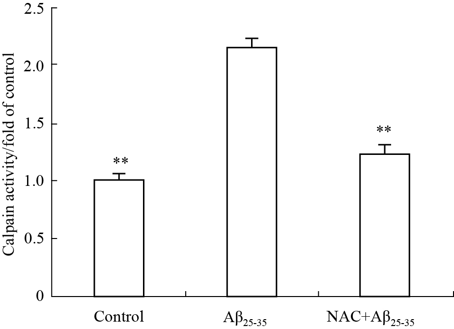Exposed to Aβ25-35 for 12 h, the calpain activity increased. Compared to the neurons treated with Aβ25-35 alone, the calpain activity decreased when the neurons were pre-incubated in NAC and co-treated with Aβ25-35. **P<0.01 vs Aβ25-35 group.