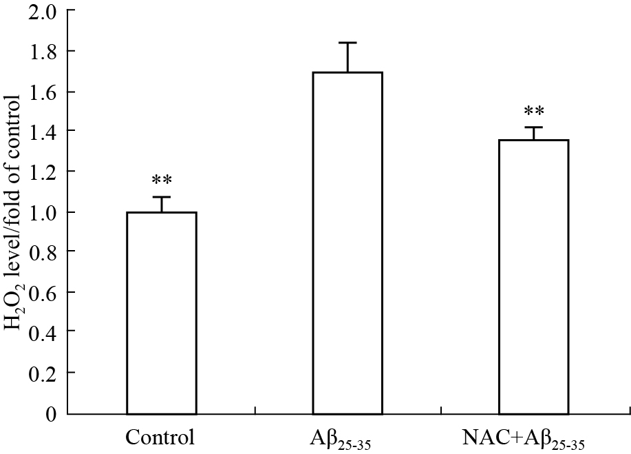 Aβ25-35 increased the H2O2 level in neurons. However, the H2O2 level in the neurons pre-incubated in 10 mmol·L-1 NAC for 24 h and co-incubated in Aβ25-35 for 12 h was lower than in those treated with Aβ25-35 alone. **P<0.01 vs Aβ25-35 group.