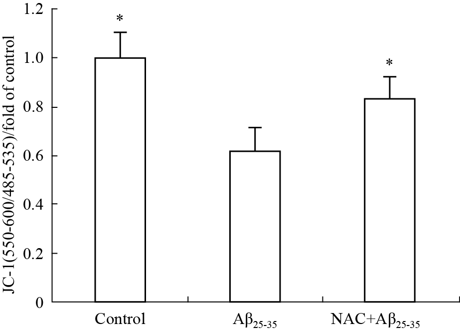 The mitochondrial membrane potential level decreased in the cortical neurons treated with Aβ25-35. However, the mitochondrial membrane potential level in the neurons pre-incubated in 10 mmol·L-1 NAC for 24 h and co-incubated in Aβ25-35 for 12 h was higher than in those treated with Aβ25-35 alone. *P<0.05 vs Aβ25-35 group.