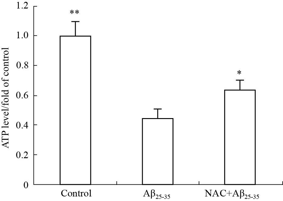 Exposed to Aβ25-35, the ATP level decreased. However, the ATP level in the neurons pre-incubated in 10 mmol·L-1 NAC for 24 h and co-incubated in Aβ25-35 for 12 h was higher than in those treated with Aβ25-35 alone. *P<0.05,**P<0.01 vs Aβ25-35 group.