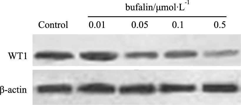 K562细胞经不同浓度蟾蜍灵处理5 d后,Western blot结果显示,随着蟾蜍灵剂量增加,K562细胞中WT1蛋白表达明显下降,呈剂量依赖性(Fig3)。