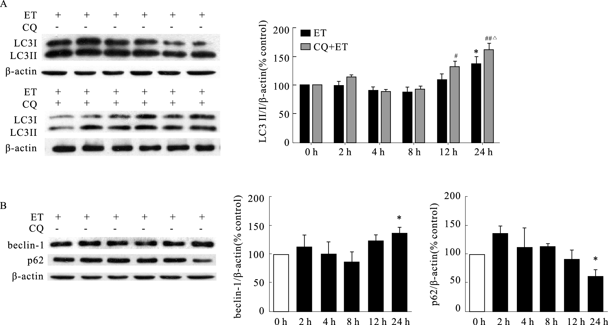 | Fig.1 Effects of ET-1 on expression of autophagy-related proteins(n=3~8) A: Effects of ET-1 on expression of LC3II/I in the presence or absence of CQ pretreatment; B:Effects of ET-1 on expression of beclin-1 and p62. *P < 0.05 vs ET 0 h; #P < 0.05, ##P < 0.01 vs ET+CQ 0 h; △P < 0.05 vs ET 24 h |