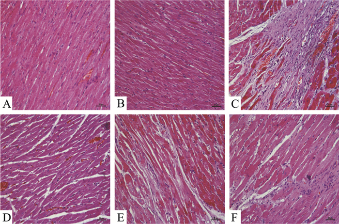| Fig 1 Morphological observation of cardiacmuscle tissue in different groups(HE×200) A: Normal; B: Sham+VEH; C: CHF+VEH; D: CHF+Losartan; E: CHF+QLQX-L; F: CHF+QLQX-H |