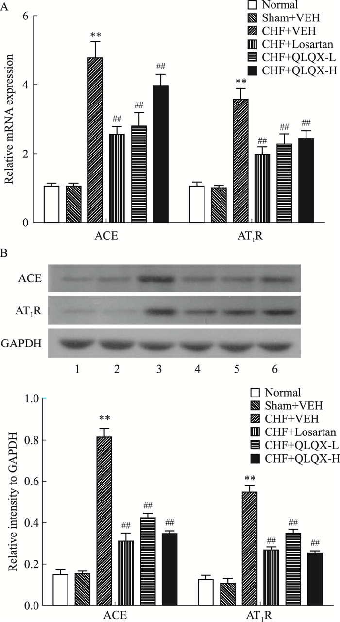 | Fig 2 The mRNA(A) and protein(B) expression of neuronalACE,AT1R in punched paraventricular nucleus tissuesmeasured by Real-time PCR and Western blot(x ± s, n=3) 1: Normal; 2: Sham+VEH; 3: CHF+VEH; 4: CHF+Losartan; 5: CHF+QLQX-L; 6: CHF+QLQX-H. **P<0.01 vs Sham+VEH; ##P<0.01 vs CHF+VEH group |