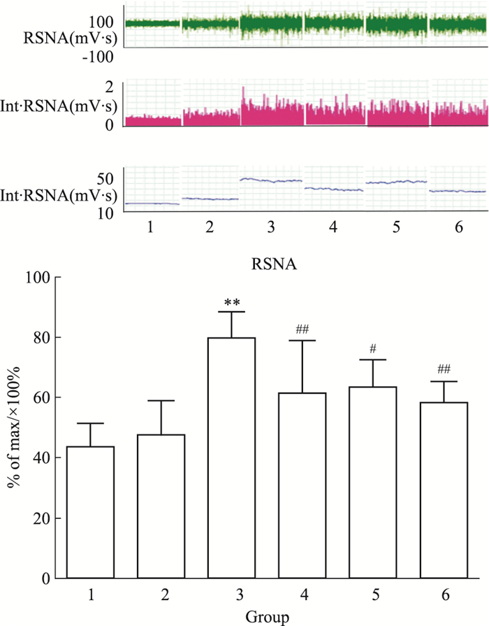 | Fig 3 Comparison of RSNA in all groups(x ± s, n=6) 1: Normal; 2: Sham+VEH; 3: CHF+VEH; 4: CHF+Losartan; 5: CHF+QLQX-L; 6: CHF+QLQX-H. **P<0.01 vs Sham group+VEH; #P<0.05, ##P<0.01 vs CHF+VEH group |