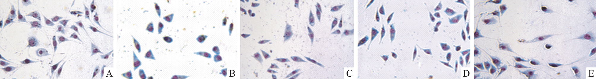 | Fig.4 Effects of LiCl on cell damage induced by okadaic acid in differentiated SK-N-SH neuroblastoma cells(×200) A:Control;B:OA 40 nmol·L-1;C:LiCl 0.1 mmol·L-1;D:LiCl 1 mmol·L-1;E:LiCl 10 mmol·L-1 |