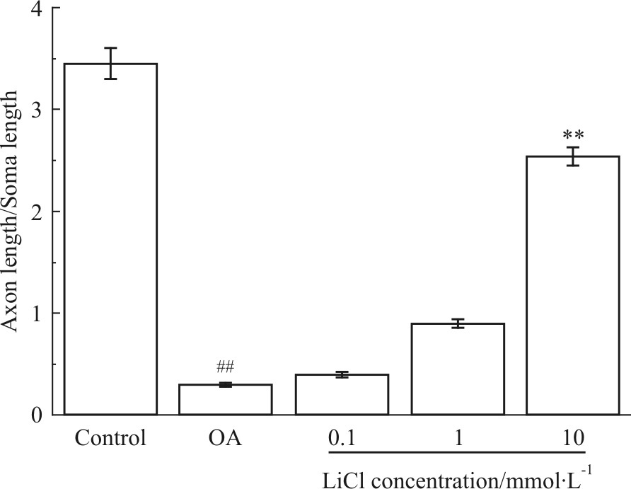 | Fig.5 Effects of LiCl on synaptic damage induced by okadaic acid in differentiated SK-N-SH neuroblastoma cells **P<0.01 vs OA;##P<0.01 vs control |