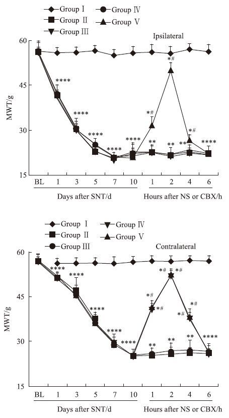 2 结果 2.1 MWT测定结果与Ⅰ组相比,Ⅱ至Ⅴ组损伤侧术后1、3、5、7、10 d MWT均明显下降(P<0.05),术后5 d降至最低,持续到10 d,而对侧术后7 d降至最低,持续到10 d;与术后10 d给药前1 h相比,Ⅱ和Ⅲ组给药后1、2、4、6 h双侧MWT均无明显差异(P>0.05);Ⅳ组给药后1、2、4、6 h损伤侧MWT无明显差异(P>0.05),而对侧给药后1 h MWT即开始提高(P<0.05),2 h时达高峰(P<0.05),6 h时与给药前无明显差异(P>0.05);Ⅴ组给药后1、2、4 h双侧MWT均明显提高(P<0.05),2 h时达高峰(P<0.05),6 h时与给药前无明显差异(P>0.05)。见Fig 1。