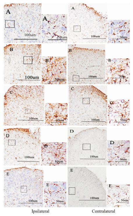 | Fig 2 GFAP expression in bilateral dorsal horns of the spinal cord in rats compared with group Ⅰ(A),the bilateral expressions of GFAP in group Ⅱ(B) and Ⅲ(C) were significantly enhanced. In group Ⅳ(D),the ipsilateral expressions of GFAP were significantly enhanced; compared with group Ⅱ (B),the bilateral expressions of GFAP in group Ⅴ(E) were significantly decreased. In group Ⅳ (D),the contralateral expression was abviously reduced. |