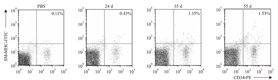 流式分析检测:含PDGF-BB(50 μg·L-1)培养基培养7d后,部分细胞开始表达α-SMA单阳性。培养14 d后,单一表达α-SMA或CD34+的阳性细胞增多,10%细胞同时表达α-SMA及CD34+。培养20 d以上,71%左右的培养细胞同时阳性表达CD34+、α-SMA(Fig 4A)。SMM-HC+为平滑肌细胞的特异性标志物,培养3周以上约有58.5%细胞阳性表达,证实培养细胞能够向平滑肌细胞分化(Fig 4B)。