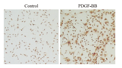 | Fig 3 Cells expressed α-SMA after cultured with PDGF-BB for 7 days Representative photomicrographs of immunocytochemical staining of the culture cells. Brown staining showed positive α-SMA expressing after PDGF-BB stimulation contrast to PBS controls. |