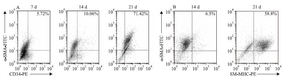 1.4.5 流式分析鉴定平滑肌祖细胞诱导培养后的d 7、d 14及d 21,选取状态较好的细胞,经胰酶消化后收集于Epidoff管中并多次洗涤,然后将细胞重悬于流式PBS中,使用antiPECD34+抗体进行表面标记,antiFITCα-SMA抗体及antiPESMM-HC+抗体进行胞内染色,避光室温孵育30 min。孵育结束后,再次使用PBS液洗涤,去除未结合的抗体。离心后重悬细胞于流式PBS中,上机检测。