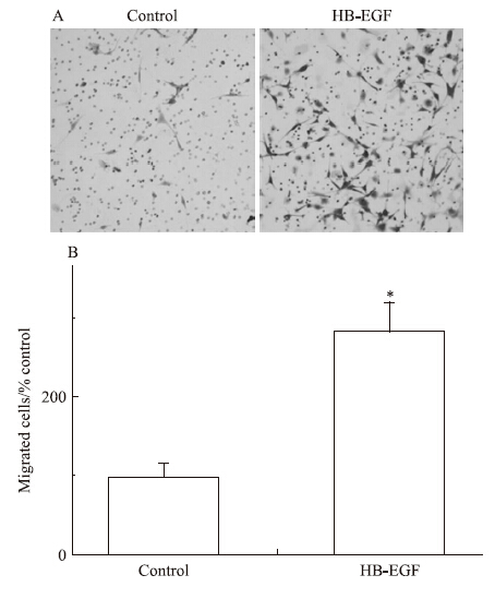 | Fig 5 Smooth muscle progenitor cells migrated in vitro A:The migration of smooth muscle progenitor cells induced by HBEGF was investigated by Boyden chamber assay;B:The magnitude of smooth muscle progenitor cells migration was expressed as the fold change of migration vs blank control group. Studies included three independent experiments.*P<0.05 compared to the blank control group. |