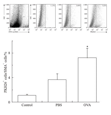 | Fig 6 Smooth muscle progenitor cells migrated in vivo Sensitized mice were transferred with smooth muscle progenitor cells labed with PKH26 red fluorescence via tail vein on day 19 and day 22,and challenged with OVA from day 18 to day 23.Control group received PBS instead. The frequency of PKH26+ labeled cells in α-SMA+ cells harvested from tracheae was analyzed by flow cytometry. The data showed as the average percentage of PKH26+ cells in α-SMA+ cells from three independent experiments. n=5/group.*P<0.05 compared with PBS and control group. |