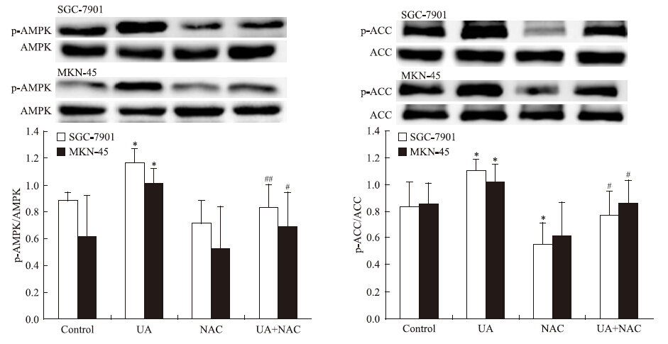| Fig 1 Effects of NAC on ursolic acid(UA)-induced AMPK and ACC phosphorylation in gastric cancer cells The top panels show a representative immunoblot of six separate experiments undertaken. The histograms at the bottom represent the relative expression of phosphoAMPK(p-AMPK) or phosphoACC(p-ACC) compared with total AMPK or total ACC respectively. All data represent the x±s of six independent experiments.*P<0.05 vs control.#P<0.05,##P<0.01 vs UA treatment without NAC pre-incubation. |