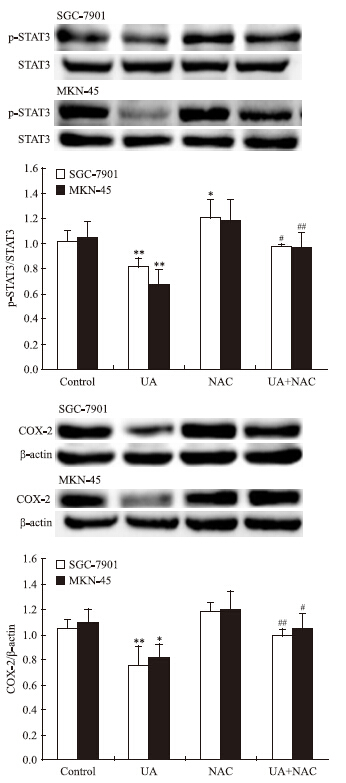 | Fig 2 Effects of NAC on UAinhibited STAT3 phosphorylation and COX-2 expression in gastric cancer cells The top panels show a representative immunoblot of six separate experiments undertaken. The histograms at the bottom represent the relative expression of phosphoSTAT3(p-STAT3) or COX-2 compared with total STAT3 or β-ac-tin respectively. All data represent the x±s of six independent experiments.*P<0.05,**P<0.01 vs control.#P<0.05,##P<0.01 vs UA treatment without NAC pre-incubation. |