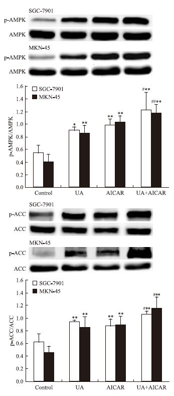 | Fig 3 Effects of AMPK activator AICAR(5-amino-4-imidazolecarboxamide ribosid-1-b-Dribofuranoside) on UA -induced AMPK and ACC phosphorylation in gastric cancer cells The top panels show a representative immunoblot of six separate experiments undertaken. The histograms at the bottom represent the relative expression of phosphoAMPK(p-AMPK) or phosphoACC(p-ACC) compared with total AMPK or total ACC respectively. All data represent the x±s of six independent experiments.*P<0.05,**P<0.01 vs control.#P<0.05,##P<0.01 vs UA treatment without AICAR pre-incubation. |