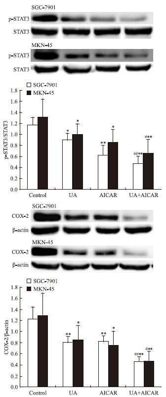 Western blot检查结果显示,AMPK激活剂AICAR单用或联合UA均可诱导SGC-7901和MKN-45细胞AMPK磷酸化(Fig 3),抑制STAT3磷酸化和COX-2表达,联合作用大于单药作用(Fig 4)。