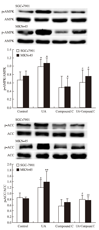 | Fig 5 Effects of AMPK inhibitor compound C on UA-induced AMPK and ACC phosphorylation in gastric cancer cells The top panels show a representative immunoblot of six separate experiments undertaken. The histograms at the bottom represent the relative expression of phosphoAMPK(p-AMPK) or phosphoACC(p-ACC) compared with total AMPK or total ACC respectively. All data represent the x±s of six independent experiments.*P<0.05,**P<0.01 vs control.#P<0.05,##P<0.01 vs UA treatment without compound C pre-incubation. |