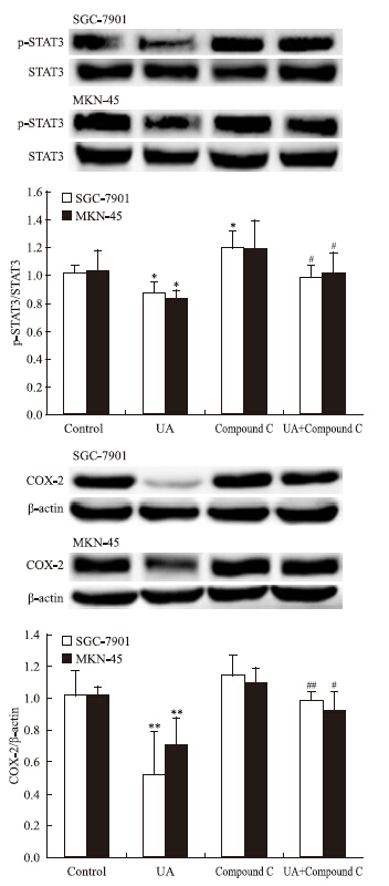| Fig 6 Effects of AMPK inhibitor Compound C on UAinhibited STAT3 phosphorylation and COX-2 expression in gastric cancer cells he top panels show a representative immunoblot of six separate experiments undertaken. The histograms at the bottom represent the relative expression of phosphoSTAT3(p-STAT3) or COX-2 compared with total STAT3 or β-ac-tin respectively. All data represent the x±s of six independent experiments.*P<0.05,**P<0.01 vs control.#P<0.05,##P<0.01 vs UA treatment without Compound C pre-incubation. |