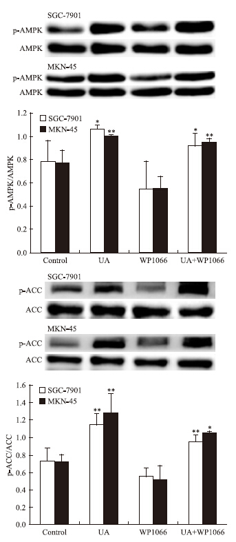 | Fig 7 Effects of STAT3 inhibitor WP1066 on UA-induced AMPK and ACC phosphorylation in gastric cancer cells The top panels show a representative immunoblot of six separate experiments undertaken. The histograms at the bottom represent the relative expression of phosphoAMPK(p-AMPK) or phosphoACC(p-ACC) compared with total AMPK or total ACC respectively. All data represent the x±s of six independent experiments.*P<0.05,**P<0.01 vs control. |